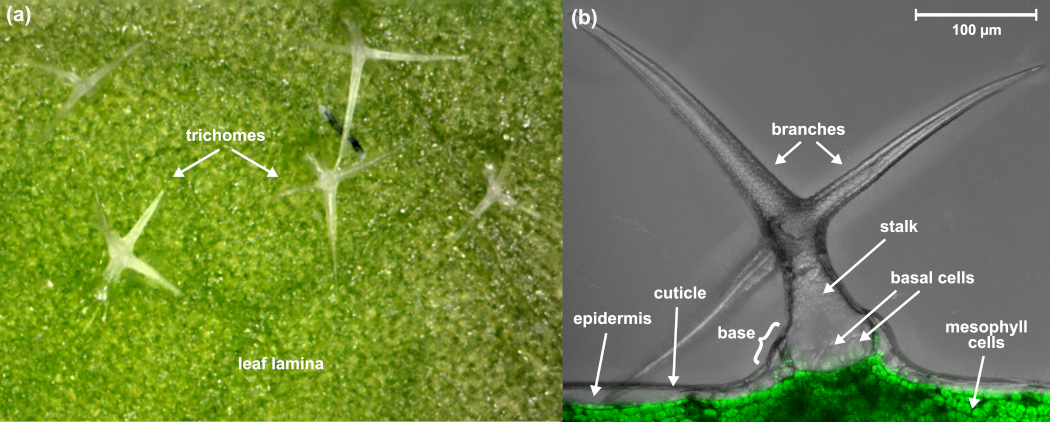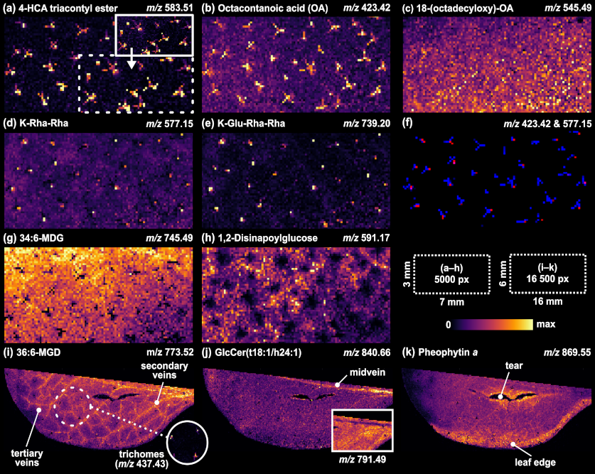 For example, Arabidopsis thaliana (A. thaliana) leaves have a complex, multilayered structure including substructures such as trichomes (plant hair), cuticular and surface waxes, veins, and epidermis, which can be difficult to analyse and spatially resolve from each other with more traditional MS imaging methods, such as MALDI.
