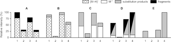 The comparison measurements were done using infusion of the mixture of compounds in acetonitrile/water (50/50) with and without dopant (toluene) in the negative ion mode. The bars represent absolute abundances of the total ion currents and proportions of [M−H], M−•, substitution products, and fragments. A = 2-naphthoic acid, B = 2-naphthol, C = 1,4-naphthoquinone, D = 1,4-dinitrobenzene, and E = hexachlorobenzene. 1 = soft X-ray APPI without dopant, 2 = VUV APPI without dopant, 3 = soft X-ray APPI with a dopant, 4 = VUV APPI with a dopant.