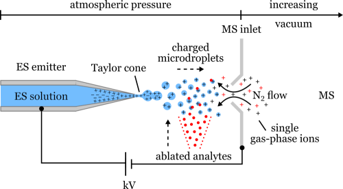The presented ESI device is typically used with 0.2–2 μL/min flow rates and is often called pure ESI to differentiate it from the pneumatically assisted emitters that are widely used in mL/min flow rate applications such as liquid chromatography-mass spectrometry LC-MS. This ESI device can also be considered to be an electrochemical cell that consists of an electrode (ES emitter), a planar counter electrode (MS inlet), and a pumped electrolyte (ES solution), and it can thus ionise analytes also through electrochemical oxidation or reduction. As such, the operation of ES post-ionisation depends on an electrically conductive solvent or solution such as water, MeOH, or ACN, or their mixtures. Furthermore, an acid or a base is often added to the ES solvent to act as a proton donor or acceptor and thus to increase the formation of protonated or deprotonated molecules. ESI allows the formation of gas-phase ions from the ablated analytes in the gas-phase and efficient ionisation of a wide-range of polar and medium–polar analytes with minimal fragmentation. ESI can produce protonated [M+H]+ and deprotonated [M–H] molecules, different alkali metal and halogen adduct ions such as [M+Na]+, [M+K]+, and [M+Cl], and multiply charged ions of large molecules, such as peptides, proteins and polymers. The formation of multiply charged ions allows the analysis of large >100 kDa molecules with mass analysers that have an upper mass limit of a few thousand m/z. The capability of ESI for macromolecular analysis at atmospheric pressure has been largely inaccessible by other MS ionisation methods such as APPI in LAAPPI.